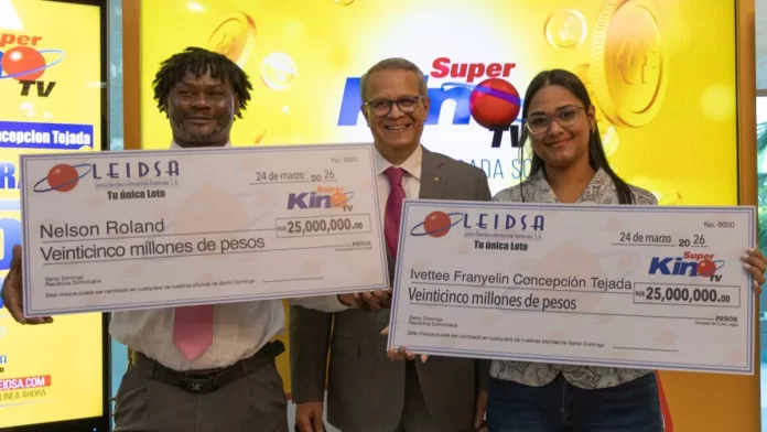 SANTO DOMINGO.- La Lotería Electrónica Internacional Dominicana, S.A. (LEIDSA), informó que entregó dos cheques de 25 millones de pesos cada uno, a los ganadores del Super Kino Tv, los señores: Ivette Franyelin Concepción Tejada y Nelson Roland.